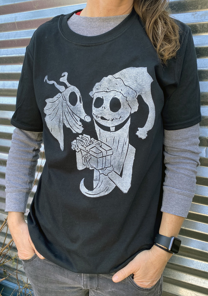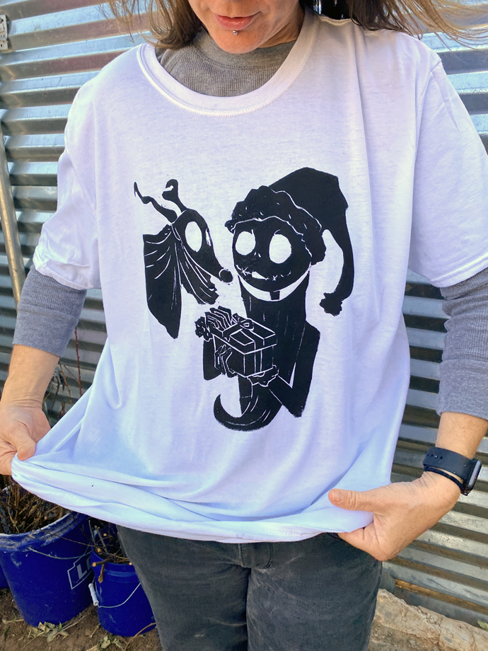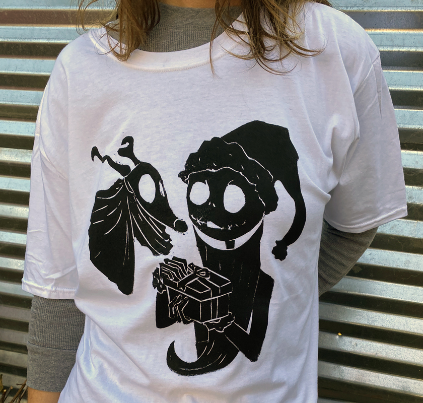 Carved image into a linoleum surface T-Shirt Colors available Navy Blue Black Gray White Gildan T-shirts that are made out of 50% cotton/50% polyester. Belle and Canvas 50% polyester, 37.5% combed and ring-spun cotton, and 12.5% rayon.