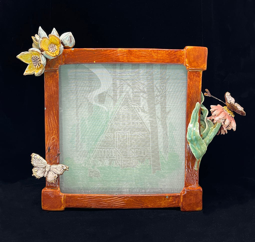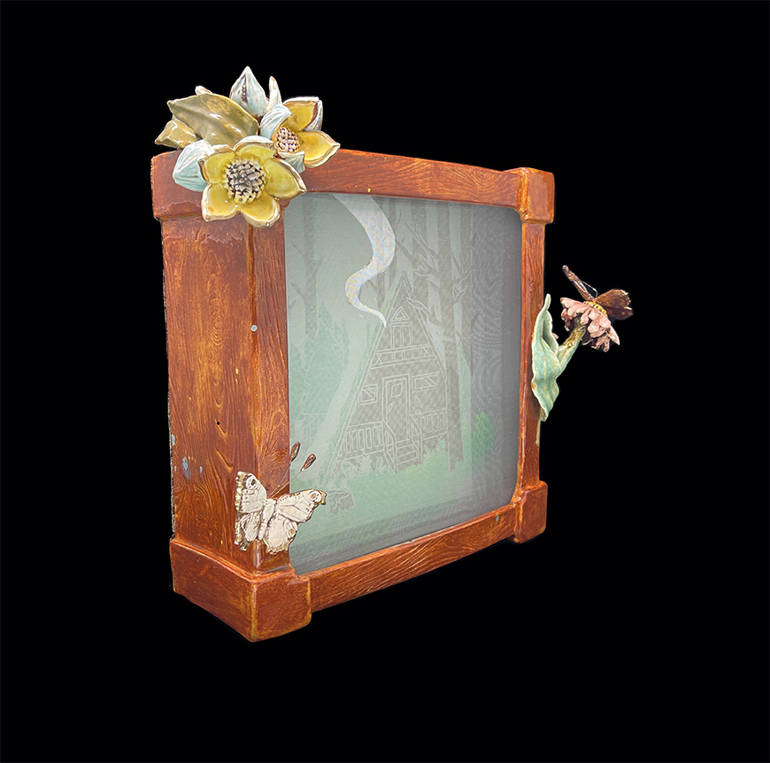 Log cabin and trees image is 3 stacked layers of block printed chiffon fabric created by Aztrid Moan. frame is hand sculpted clay to represent a wood box, flowers and purple butterflies created by Nicole Moan.