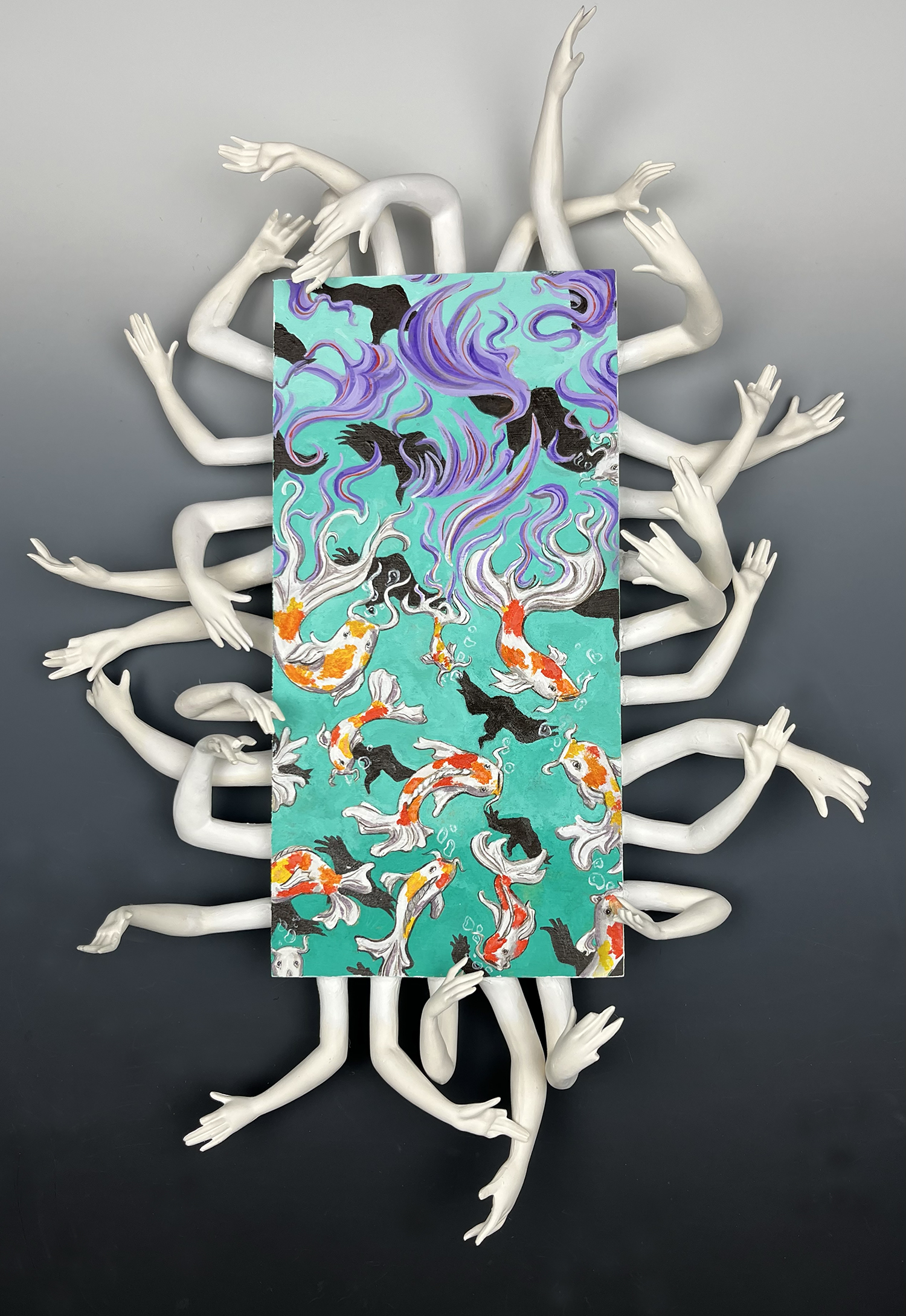 The ending is always a surpise 18x14x3” Acrylic and clay on a birch panel