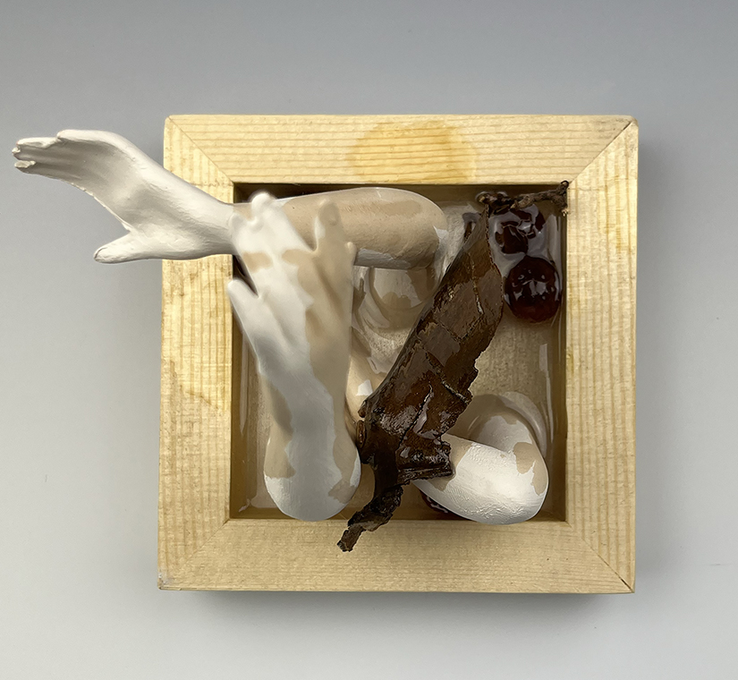 Helping Hands Ceramic Sculpture 4x4x4” Clay and natural object on a wood panel